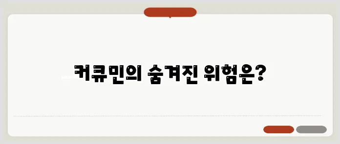 커큐민은 항응고 효과가 있을 수 있기 때문에, 과도하게 섭취할 경우 출혈의 위험이 증가할 수 있습니다. 특히 수술 전후나 혈액 응고에 영향을 줄 수 있는 약물을 복용 중인 경우 주의가 필요합니다.